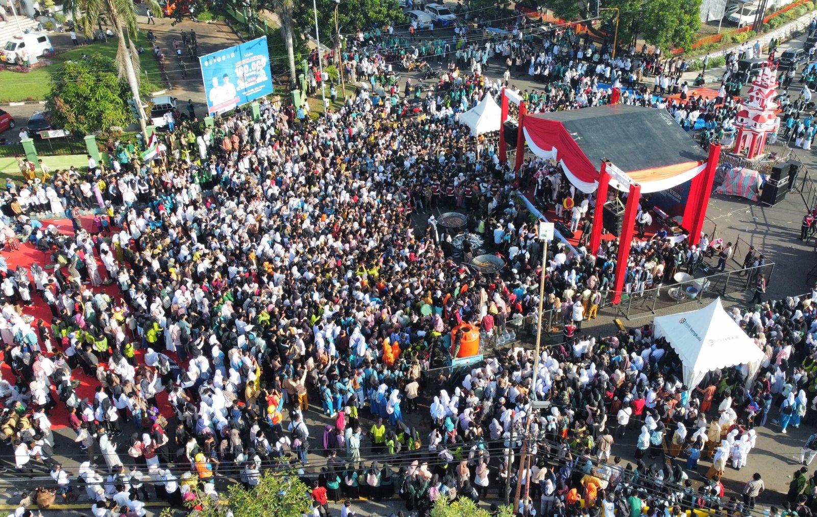 Suasana haru dan sukacita menyelimuti pelataran Masjid Raya Baitul Izzah, Kota Bengkulu, Sabtu (9/3). Puluhan ribu masyarakat memadati kawasan tersebut untuk mengikuti Makan Akbar 100 Ribu Orang, sebuah agenda kebersamaan yang digagas langsung oleh Gubernur Bengkulu, Helmi Hasan.