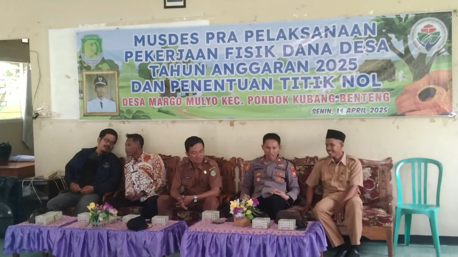 Kegiatan tersebut berlangsung di balai desa setempat dan dihadiri oleh berbagai pihak penting, antara lain Kepala Desa Margo Mulyo, Syaifurohman, Camat Pondok Kubang, Ferry Afrianto, S.Sos, Kapolsek IPTU Randi, Babinsa Peltu Sukur, serta Bhabinkamtibmas Peltu Yardi. Selain itu, turut hadir Ketua Badan Permusyawaratan Desa (BPD), tokoh masyarakat, tokoh agama, tokoh adat, serta para pendamping desa dan kecamatan.
